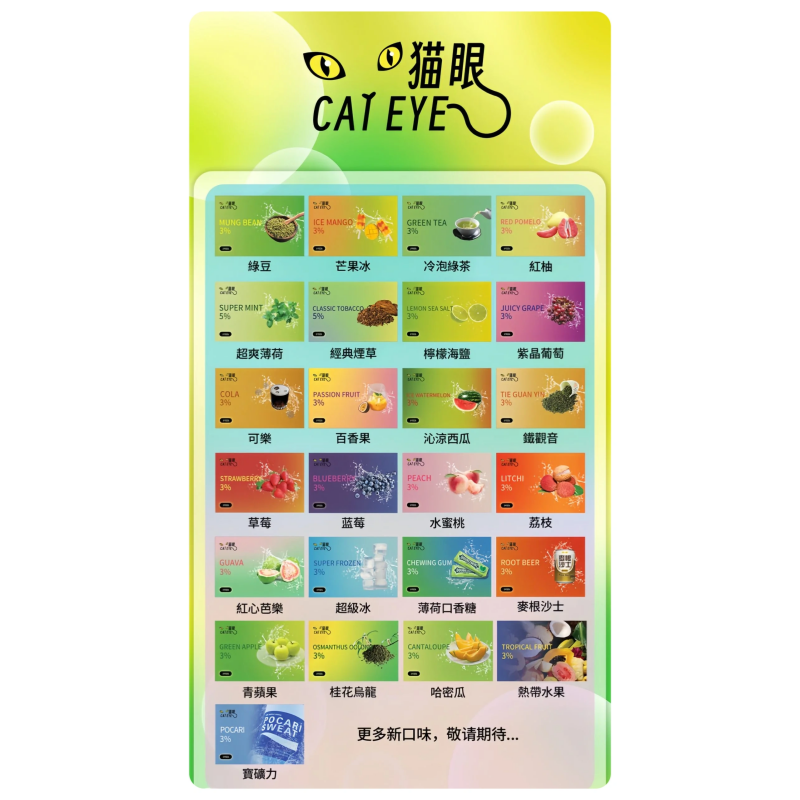 貓眼一代煙彈系列精心挑選高品質煙油,經過精密配方調配,讓每一口煙霧都散發著濃郁的香氣和純正的口感,令人心曠神怡。